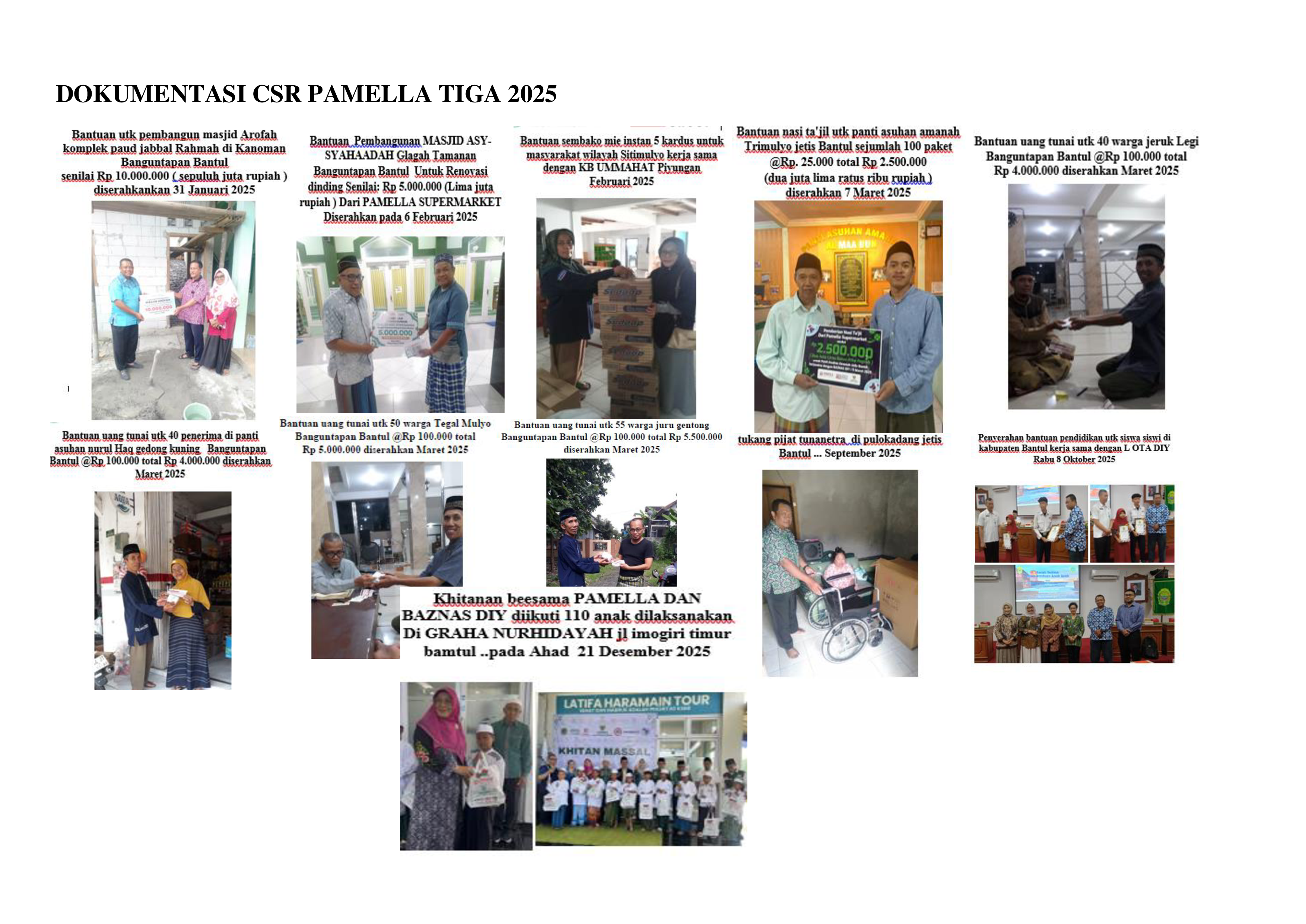 1 . PEDULI IBADAH : BANTUAN UANG TUNAI UNTUK PEMBANGUNAN FASILITAS MASJID MASJID AROFAH KOMPLEK PAUD JABAL RAHMAH Rp. 10.000.000,- 31 JANUARI 2025 2. PEDULI IBADAH : BANTUAN GRANIT UNTUK DINDING DALAM MASJID MASJID Asy. SYAHAADAH GLAGAH TAMAN BANGUNTAPAN BANTUL Rp. 5.000.000,- 6 FEBRUARI 2025 3. PEDULI UMAT BANTUAN SEMBAKO BERUPA MIE INSTAN WARGA SITI MULYO KERJASAMA DENGAN KB UMMAHAT SITI MULYO MASYARAKAT KURANG MAMPU 5 KARTON MIE INSTAN Rp. 500.000,- FEBRUARI 2025 4. PEDULI UMAT BANTUAN PAKET NASI TA’JIL PANTI ASUHAN AMANAH TRIMULYO JETIS BANTUL 100 PAKET @Rp. 25.000,- TOTAL Rp. 2.500.000,- MARET 2025 5. PEDULI UMAT BANTUAN UANG TUNAI UNTUK BULAN RAMADHAN IDUL FITRI, MARET 2025 - JERUK LEGI, WARGA KURANG MAMPU 40 = Rp. 4.000.000,- - NURUL HAQ GEDONG KUNING, WARGA KURANG MAMPU 40 = Rp. 4.000.000,- - TEGAL MULYO, WARGA KURANG MAMPU 50 = Rp. 5.000.000,- - JURU GENTONG, WARGA KURANG MAMPU 55 = Rp. 5.500.000,- 6. PEDULI UMAT BANTUAN KURSI RODA, DUSUN WULO KADANG, JETIS BANTUL, MASYARAKAT KURANG MAMPU 1 UNIT KURSI RODA Rp. 980.000,- SEPTEMBER 2025 7. PEDULI PENDIDIKAN, BANTUAN UANG TUNAI KERJASAMA DENGAN LOTADIY OKTOBER 2025 GEDUNG INDUK PARASAMYA BANTUL, 16 SISWA SISWI SD = Rp. 3.840.000,- 8. PEDULI KESEHATAN : KHITANAN GRATIS DESEMBER 2025 , GRAHA NURHIDAYAH JALAN IMOGIRI TIMUR, ANAK DARI KELUARGA KURANG MAMPU, 100 ANAK = Rp. 8.482.500,-